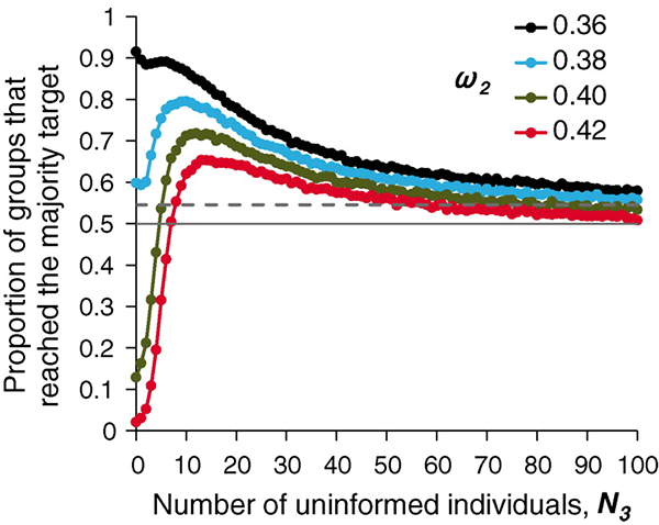 По мере роста N3 вероятность «демократичного» решения поначалу увеличивается. Присутствие наивных индивидов мешает меньшинству навязывать группе свою волю. Впрочем, этот эффект сохраняется лишь до тех пор, пока доля наивных особей не достигнет некоторого критического значения. После этого дальнейшее увеличение N3 будет уже не увеличивать, а снижать вероятность демократичного решения. При высоких значениях N3 эта вероятность приближается к 1/2, то есть к выбору решения наугад — как если бы группа делала выбор, подбрасывая монетку. Иными словами, умеренная примесь наивных особей повышает «демократичность» системы принятия решений, а слишком большая делает эту систему хаотичной, так что решение в итоге будет приниматься случайным образом, независимо от того, что думают по этому поводу информированные особи.