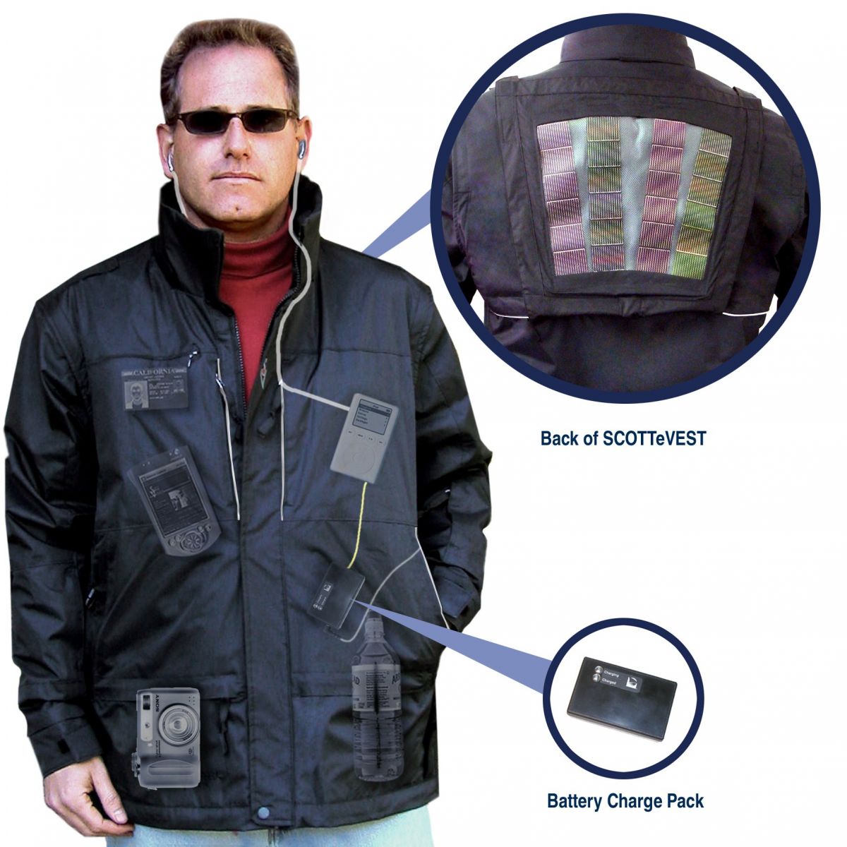 Карманы для мобильных телефонов – это уже не новость, миру хочется большего. А почему бы этому карману еще не служить зарядным устройством? «SCOTTeVEST» – американская компания выпустила для продажи куртку, которая стоит примерно 400 долларов, эта куртка может за пару часов зарядить мобильное устройство, например, телефон или фотоаппарат. Идея куртки достаточна простая – на плечах человека крепятся гибкие солнечные батареи, они преобразовывают солнечный свет в электроэнергию, которая поступает в карманы для подзарядки по проводам.