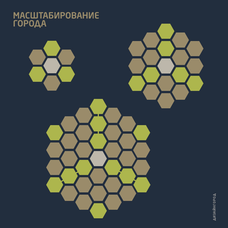 Это город, состоящий из сот-кварталов, разделенными дорогами. Зеленые зоны — это крупные парки развлечений и отдыха.