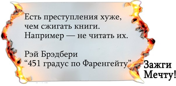 Интересно, что «451 градус по Фаренгейту», написанный в 1953 году, в наши дни обернулся суровой реальностью… Мрачные предчувствия не обманули создателя романа. Стоит прочитать несколько фрагментов произведения – и поразиться способности автора заглянуть в будущее. «Журналы превратились в разновидность ванильного сиропа. Книги – в подслащенные помои. Читатель прекрасно знал, что ему нужно, и, кружась в вихре веселья, он оставил себе комиксы. Ну и, разумеется, эротические журналы. Теперь вы можете всегда быть счастливы: читайте себе на здоровье комиксы, разные там любовные исповеди и торгово-рекламные издания». «Цветным не нравится книга „Маленький черный Самбо“. Сжечь ее. Белым неприятна „Хижина дяди Тома“. Сжечь и ее тоже. Кто-то написал книгу о том, что курение предрасполагает к раку легких. Табачные фабриканты в панике. Сжечь эту книгу».