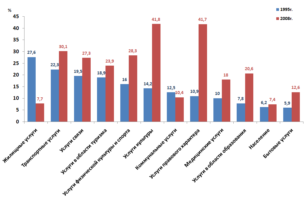 Повышение доли сервиса в ВВП и структуре занятости социума, само по себе не означало развития отраслей услуг в абсолютных статистических показателях. Основной удар распад СССР нанес по сектору промышленности. Но разрушение базового для экономики сектора повело разрушение и других производных от него отраслей услуг. За исключением по сути одного – финансового направления. Вошедшие в обиход в постсоветский период достаточно широкое понятие сервис нивелировало более частную проблему бытового обслуживания населения. Результатом этой нивелировки явился парадокс разновекторной динамики указанных показателей. В то время как финансовые потоки в сфере сервиса неуклонно возрастали, бытовые услуги в общей структуре сервисной деятельности столь же устойчиво сокращались. (См. рис.9) [15].