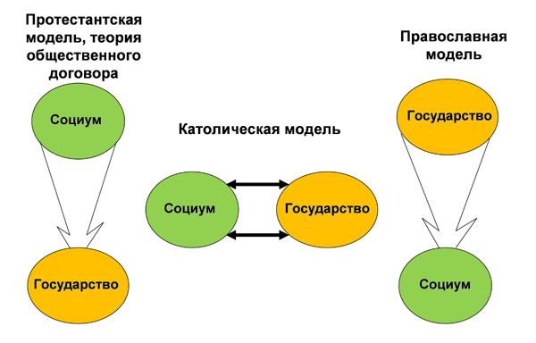Рис.1. Религиозные парадигмы моделей государственности. Сервисное государство как проекция протестантского религиозного типа
