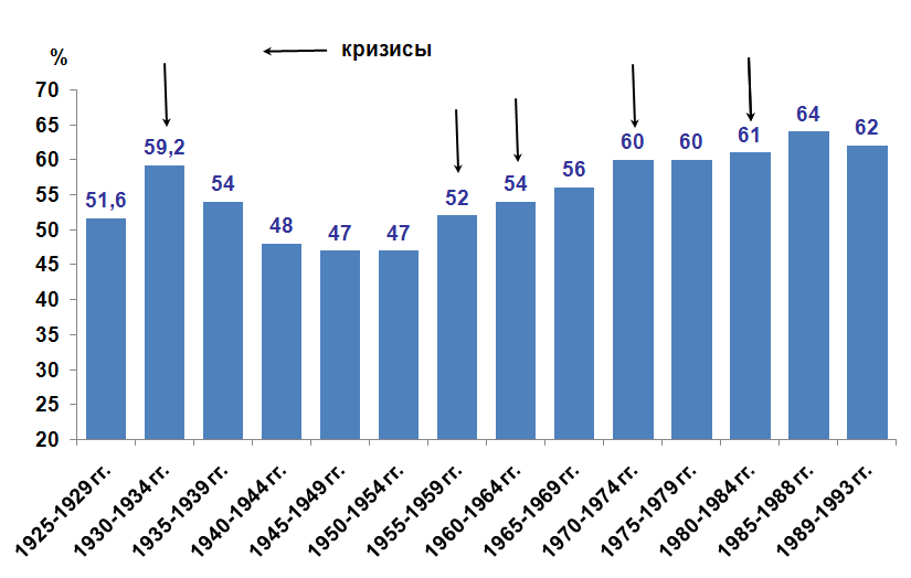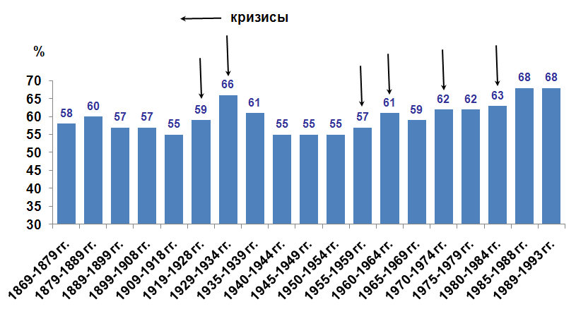 Закономерности, прослеживаемые по отношению к экономике США, подтверждаются и на статистических материалах других стран. В нашем распоряжении имеются, в частности, данные Б. Митчелла по доле сферы услуг в ВВП Канады. И вновь периоды кризисов совпадают с динамикой сервисизации экономики. Три крупнейших для Канады кризиса первой половины 1930-х, 1957 и 1973 гг. – точно соотносятся с катализацией долевого роста сервисного компонента. (См. рис.2, 3) [3].