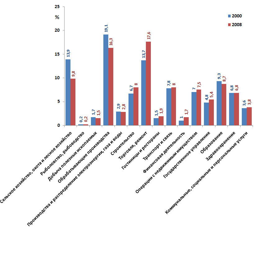 Показательны изменения, произошедшие в структуре занятости населения. Еще в 2000 г. больше всего россиян было трудоустроено в сфере обрабатывающего производства, на второй позиции находилось сельское хозяйство. Теперь первую строчку занимает направление торговля и ремонт. По доле торговцев и ремонтников Россия превосходит сегодня любую из западных стран. Помимо обрабатывающего производства и сельского хозяйства, снизили свое долевое значение: добыча полезных ископаемых; производство и распределение электроэнергии, газа и воды; образование. Наряду со статьей торговли и ремонта, возрос удельный вес в структуре занятости: финансовой деятельности; операций с недвижимым имуществом, аренды и предоставлений услуг; строительства; гостиниц и ресторанов; транспорта и связи; государственного управления; предоставления коммунальных, социальных и персональных услуг. (См. рис.8) [16, С 140]. Происходило, таким образом, за некоторыми исключениями, усиление позиции тех направлений, которые Л. Ляруш относит к сферам концентрации фиктивного капитала. Россияне стали больше торговать и заниматься финансовыми операциями, но при этом меньше работать над производством реальных товаров в промышленном и аграрном секторах[8].