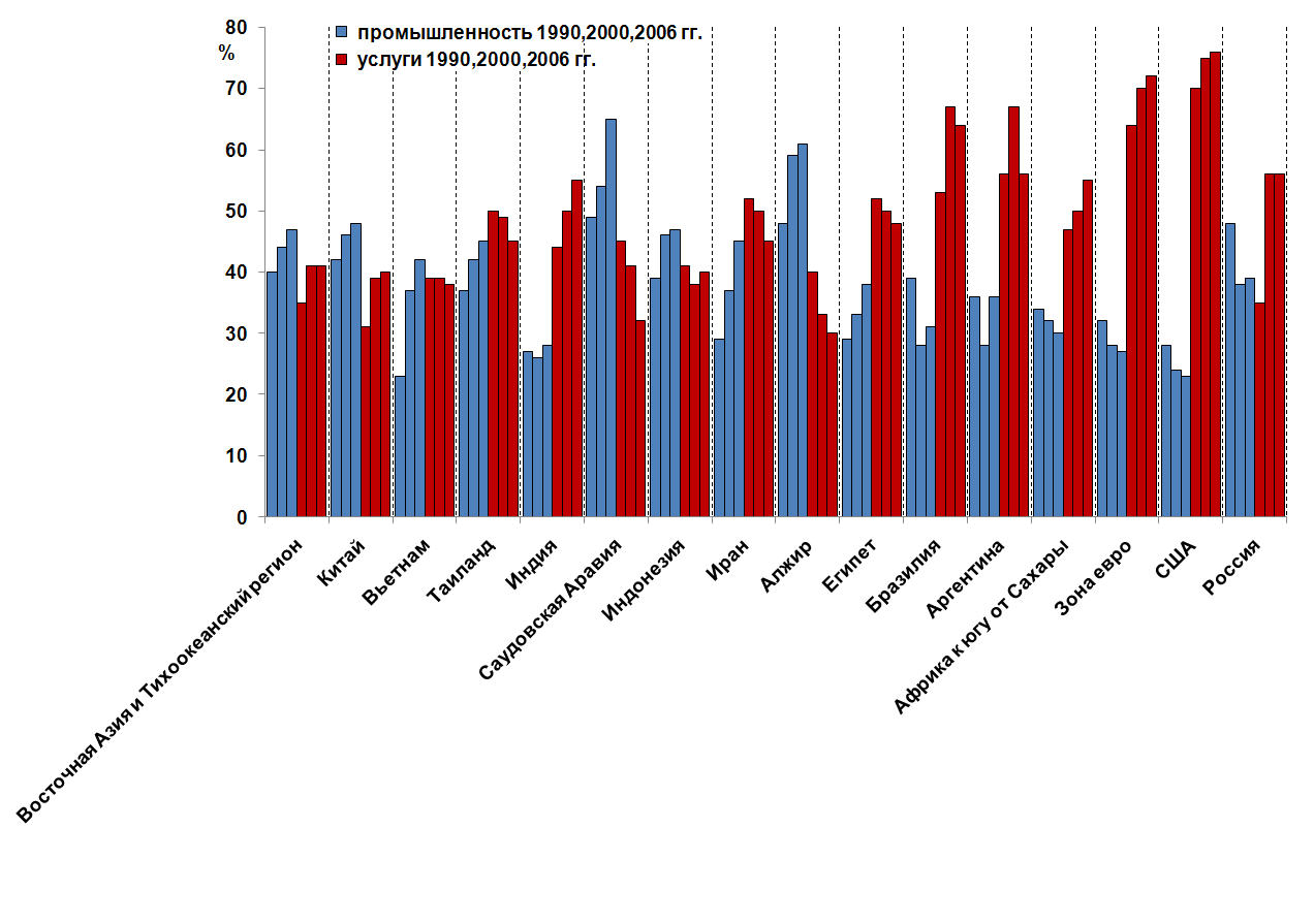 Рис.10. .Добавленная стоимость в сферах промышленности и услуг по регионам мира, % ВВП