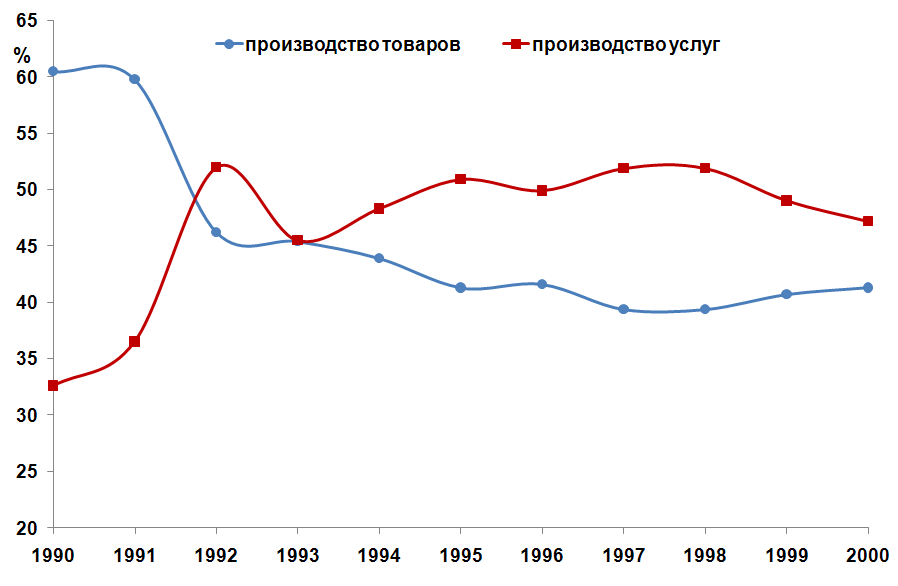 Рис.7. Структура производства валового внутреннего продукта в России в период трансформации 1990-х гг., в %