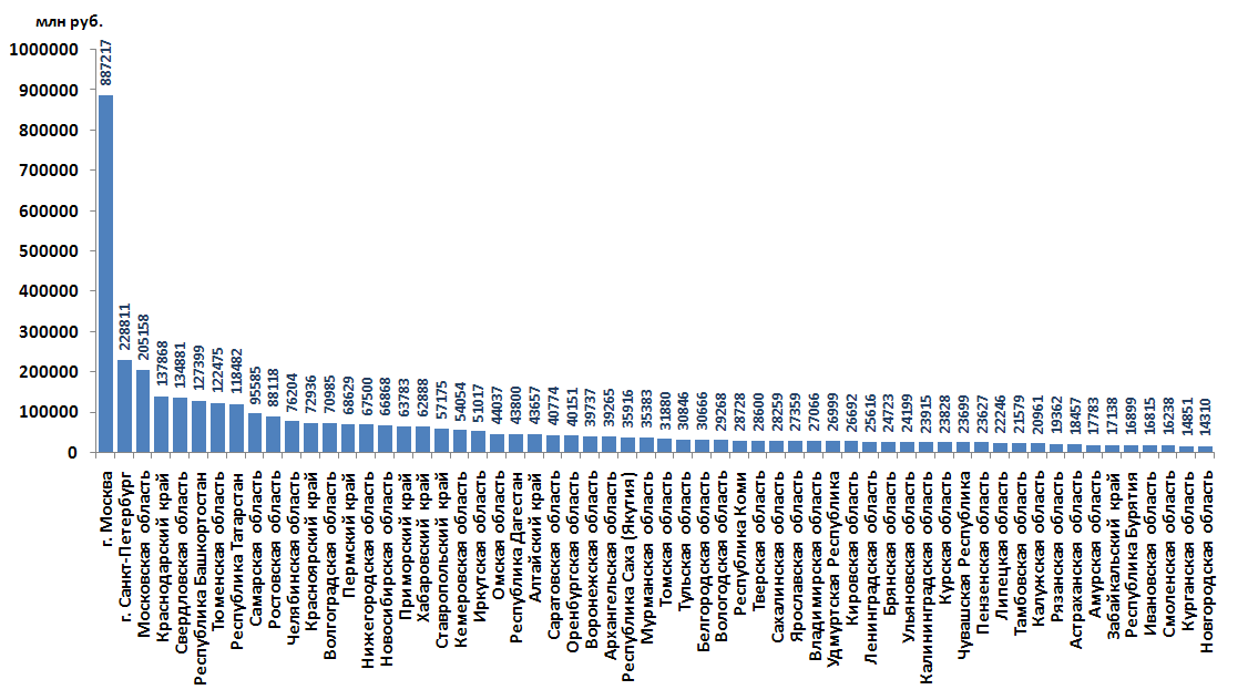 Рис.12. Объем платных услуг населению в РФ по субъектам Федерации