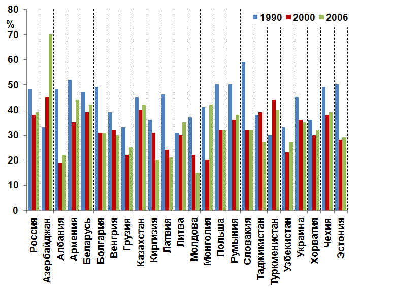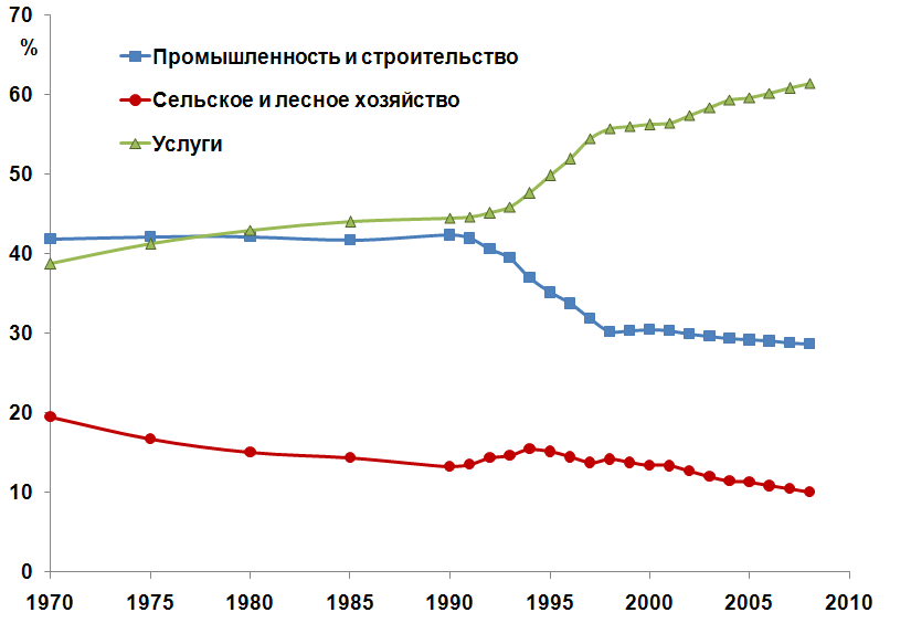 Распад СССР хронологически четко соотносится с процессом сервисной трансформации. Все произошло в точном соответствии с рецептурой постиндустриального перехода. Доля занятых в сфере услуг резко возросла, тогда как в промышленности и строительстве стремительно снизилась. Прослеживается при этом три различных по динамике изменеий этапа. В позднесоветский период услуги, по аккумуляции экономически занятого населения, постепенно догоняют промышленность и в 1980-е гг. получают незначительный перевес. Трансформационный процесс на этом этапе шел крайне медленно. Но уже тогда, сев на иглу нефтяного экспорта, Советский Союз фактически отказался от необходимого для него нового индустриального рывка. На втором этапе – в 1990-е гг. процесс деиндустриализации экономики России приобрел революционный характер. Это были, по-видимому, самые высокие за всю историю мировой экономики темпы сервисной трансформации. Деиндустриализационный пафос 1990-х выразился даже в незначительном повышении удельного веса в структуре занятости сельского и лесного хозяйства. Постиндустриализм удивительным образом выродился в России в экономическую и социальную архаизацию. На третьем этапе – в 2000-е гг. темпы сервисной трансформации несколько снизились, однако сам вектор деиндустриализации остался неизменным. (См. рис.6) [16].