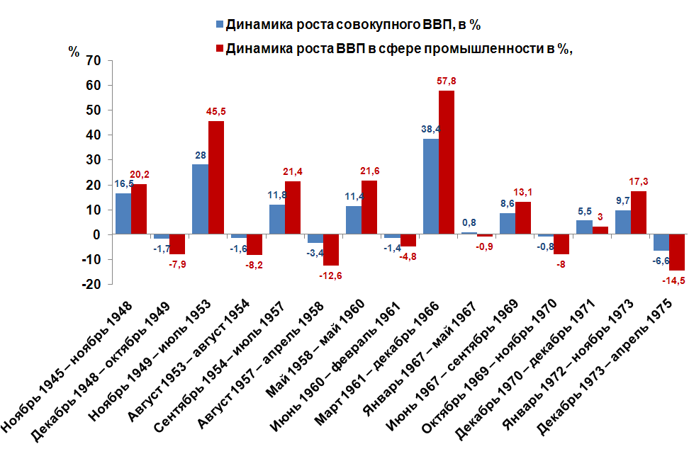 Рис.4. Соотношение динамики роста совокупного ВВП с динамикой роста ВВП в сфере промышленности в экономике США (1945-1975 гг.), в %