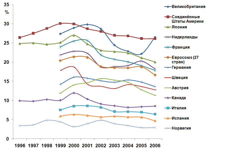 Другое дело, что Запад убедительно лидирует по доле продаваемого высокотехнологического товара. Но это преобладание сложилось не сегодня, и удельный вес соответствующего компонента в торговой структуре остается неизменным. Более того, фактически по всем западным странам за период 2000-х гг. этот показатель даже снизился. (См. рис.18) [2]. Какой уж тут постиндустриальный переход?!