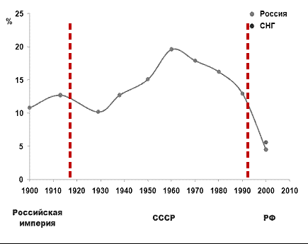 Рис.5. Доля России в мировом промышленном производстве, в %