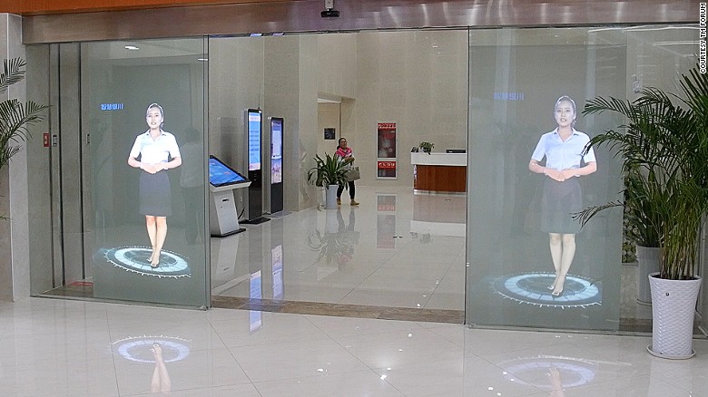 Первые голографические приемные появились в здании городской администрации. Две улыбающиеся девушки приветствуют всех посетителей мэрии.