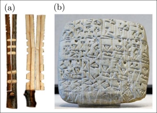 (a) Палочки для записи долговых обязательств из средневековой Европы. (b) Их предшественники, на тысячу-другую лет древнее. Ничто не мешает сделать неуничтожимые криптозаписи для антиденег?